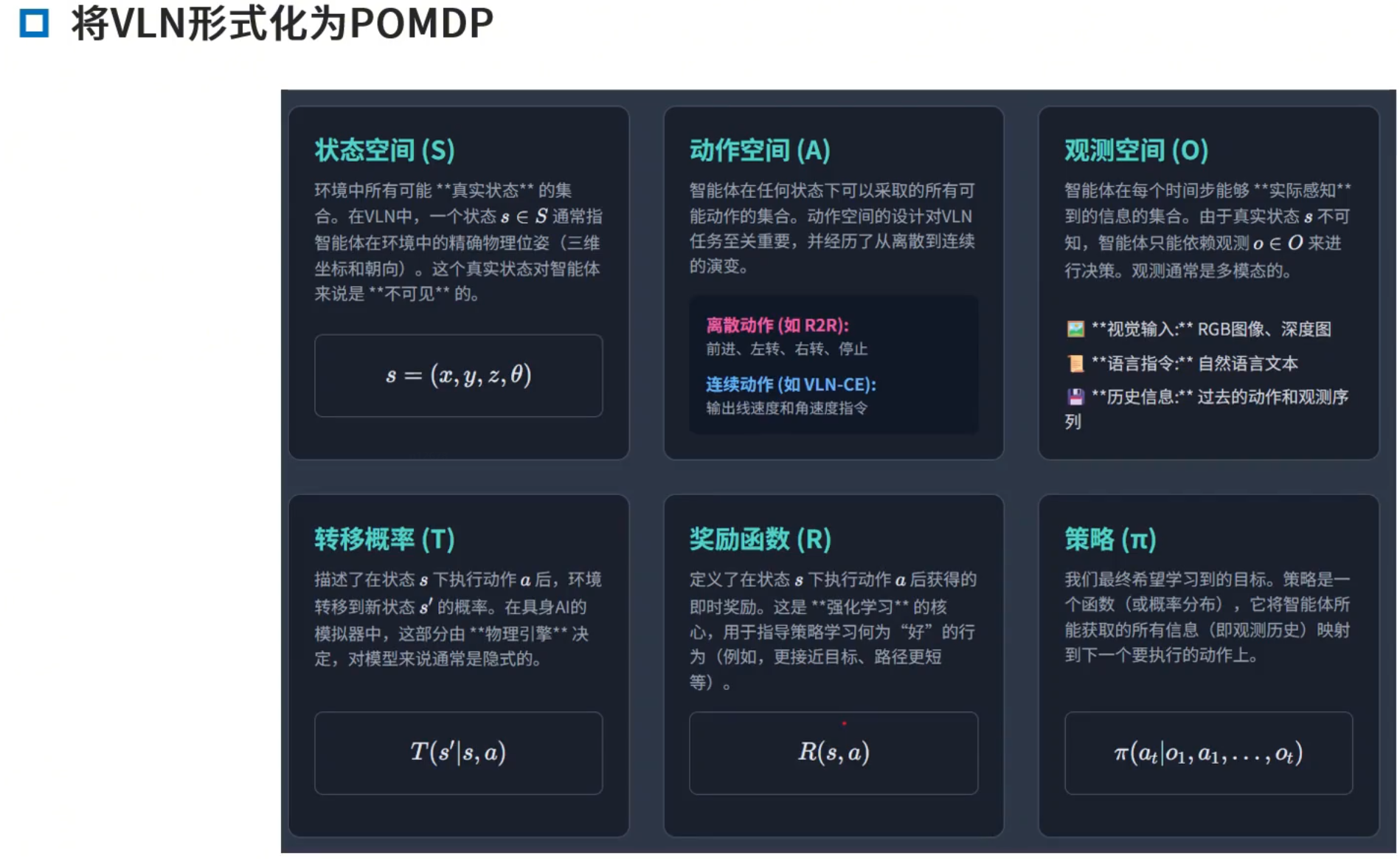 VLN的数学框架:本质上为一个在不确定性下的序列决策问题,用部分可观测马尔可夫决策过程决定(POMDP)