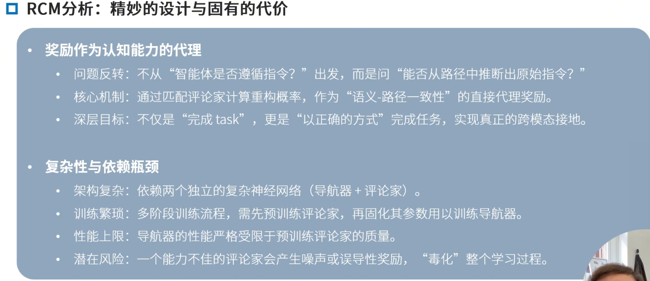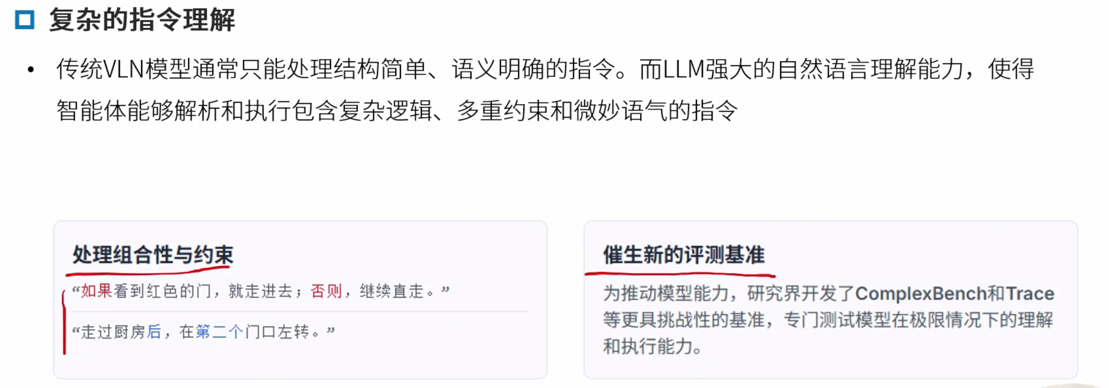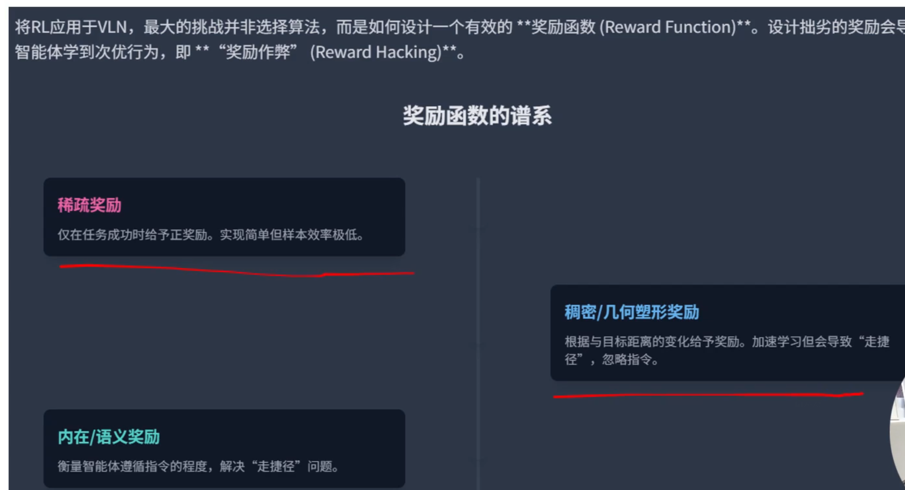 稠密/几何奖励:根据目标距离去给奖励,能加速学习,但是这样会忽略指令,会走捷径,如穿过某个东西后到达某地
