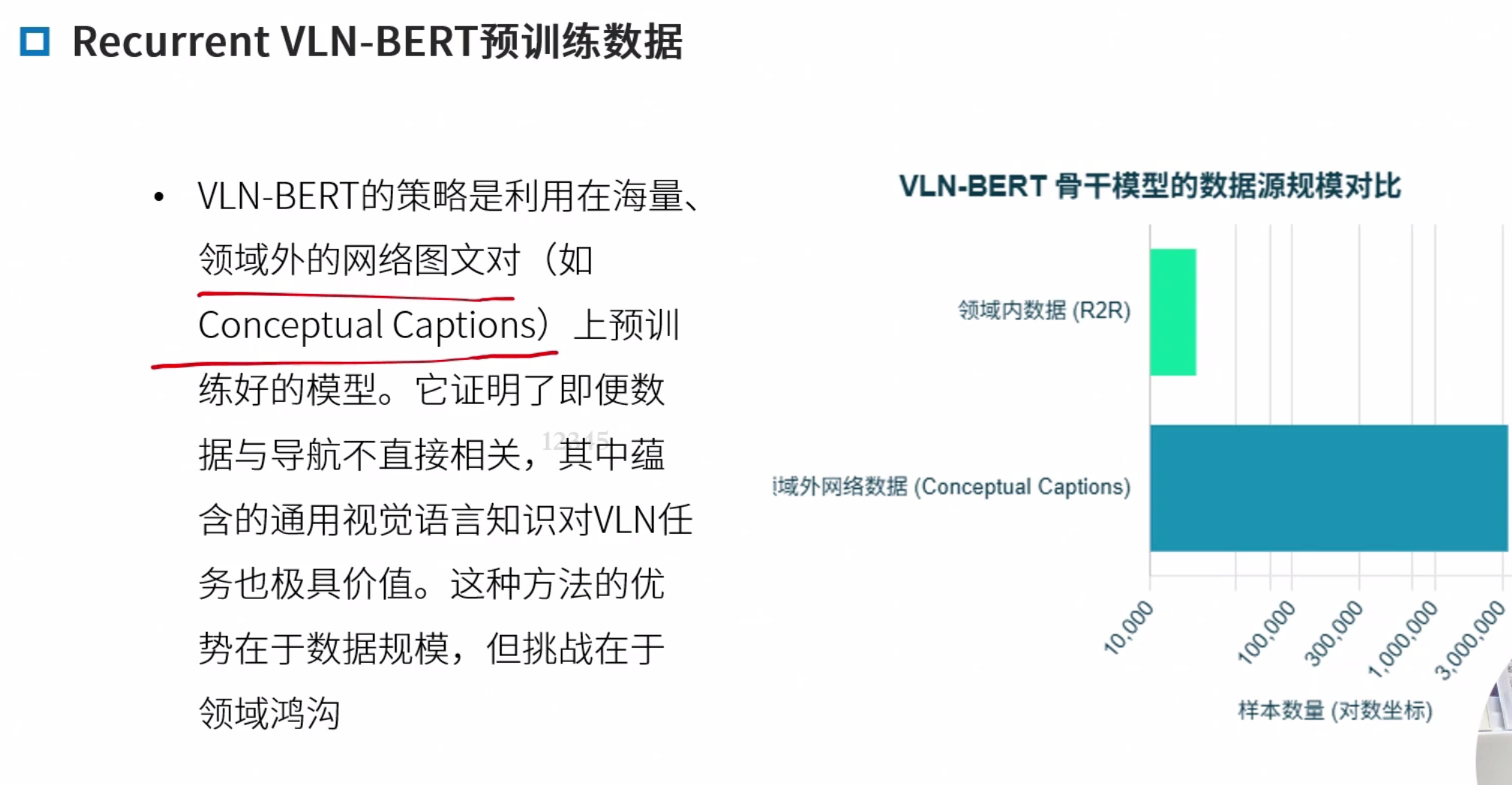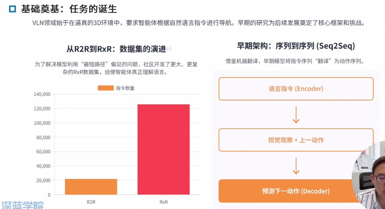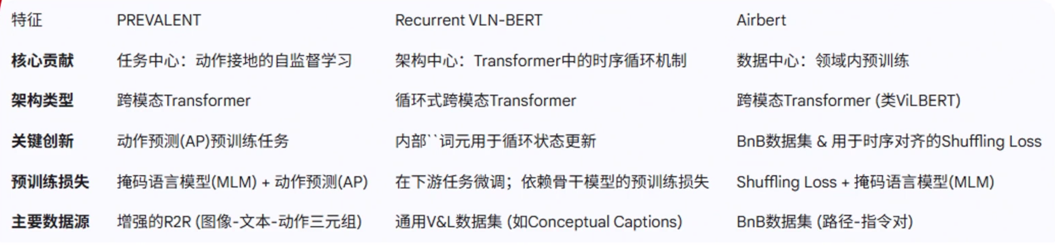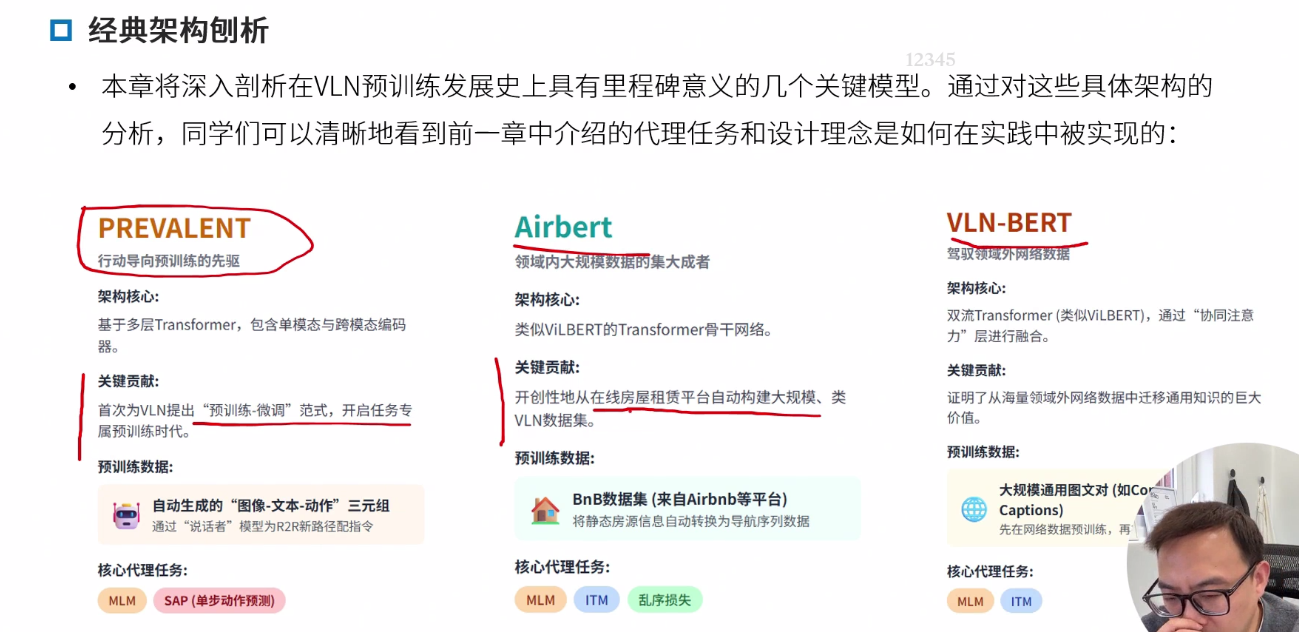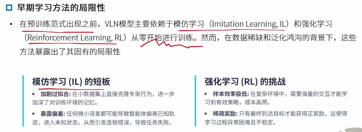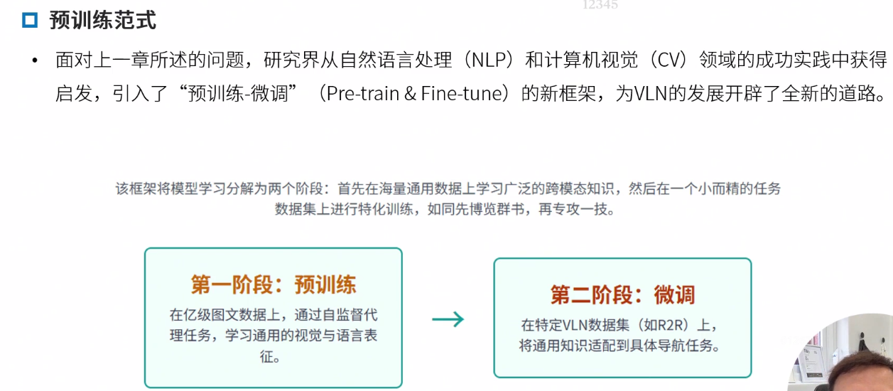 领域内与领域外预训练 领域内:类导航数据,优点任务相关性强,直接服务导航,缺点,早期数据集规模小,成本高 领域外:使用图文对(如网页图片)。优点 数据规模大 多样性高,缺点,与导航任务差异大,缺乏时序和动作信息。