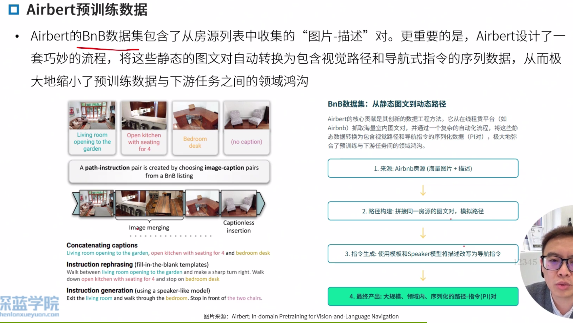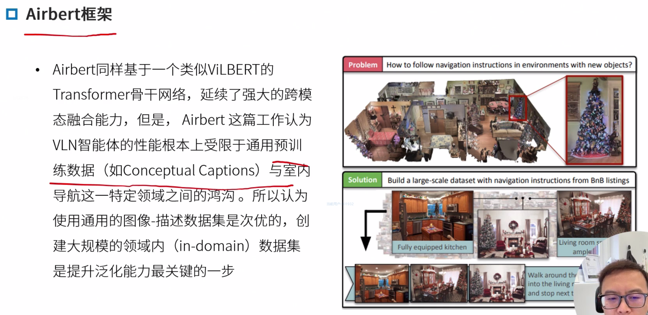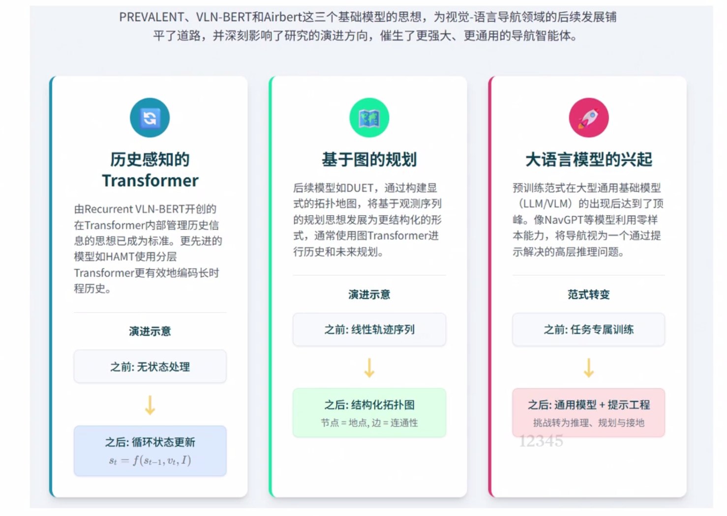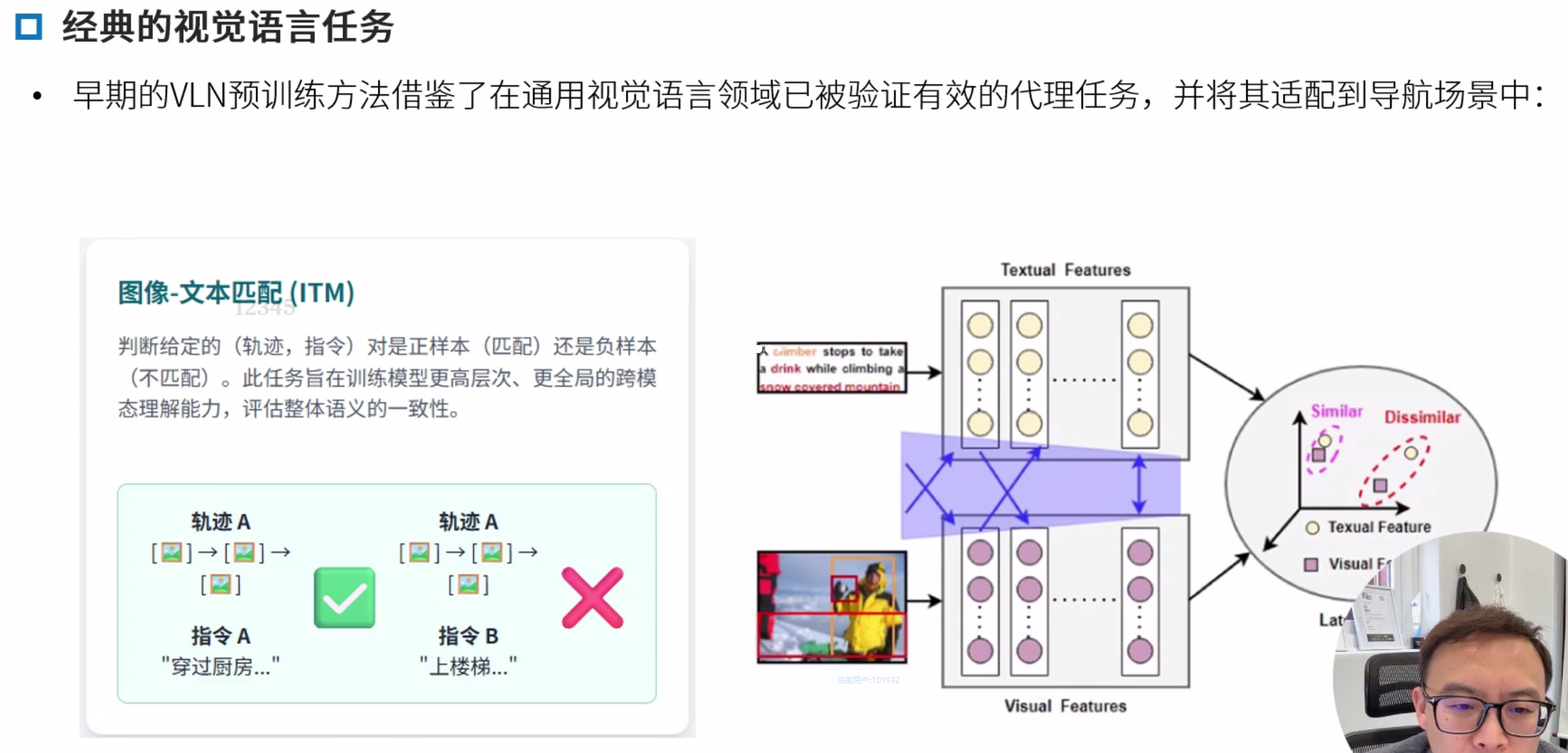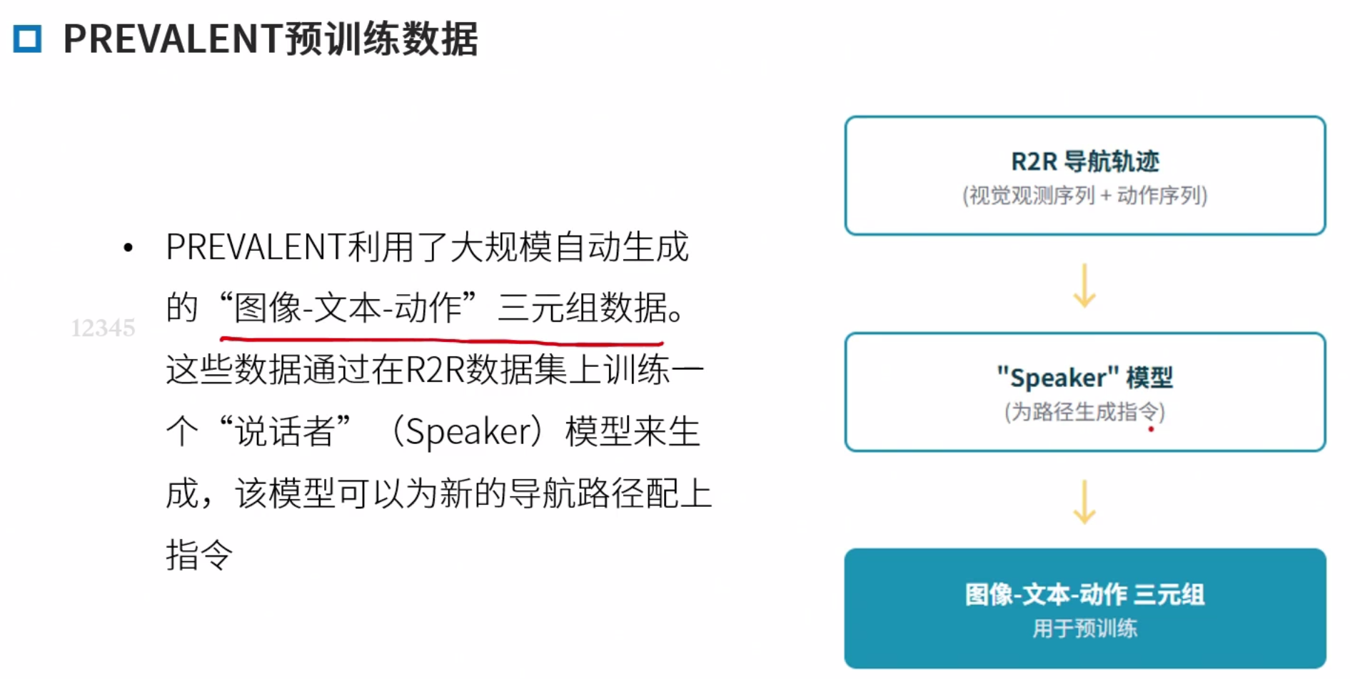 领域内与领域外预训练 领域内:类导航数据,优点任务相关性强,直接服务导航,缺点,早期数据集规模小,成本高 领域外:使用图文对(如网页图片)。优点 数据规模大 多样性高,缺点,与导航任务差异大,缺乏时序和动作信息。