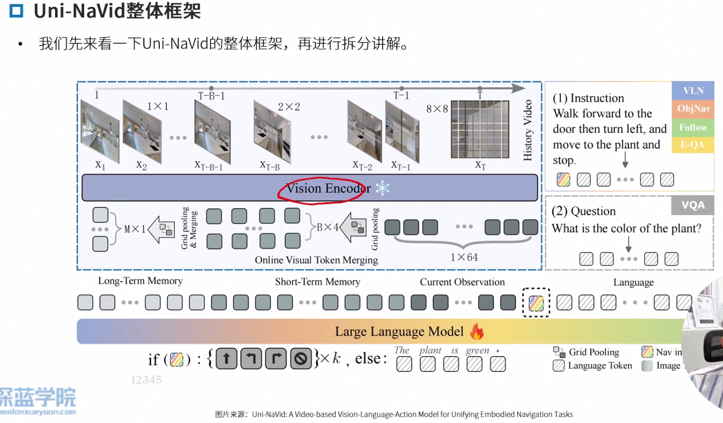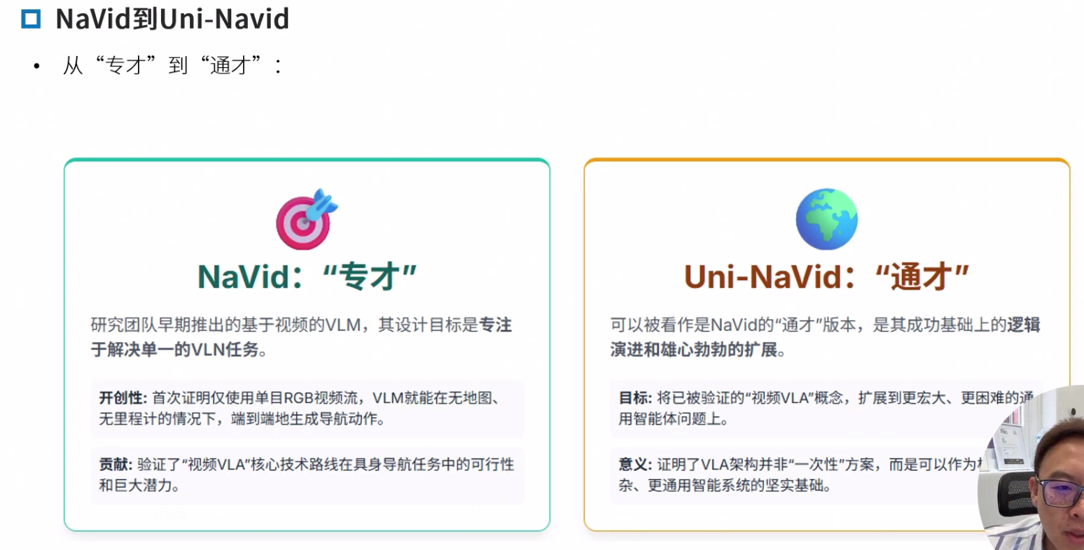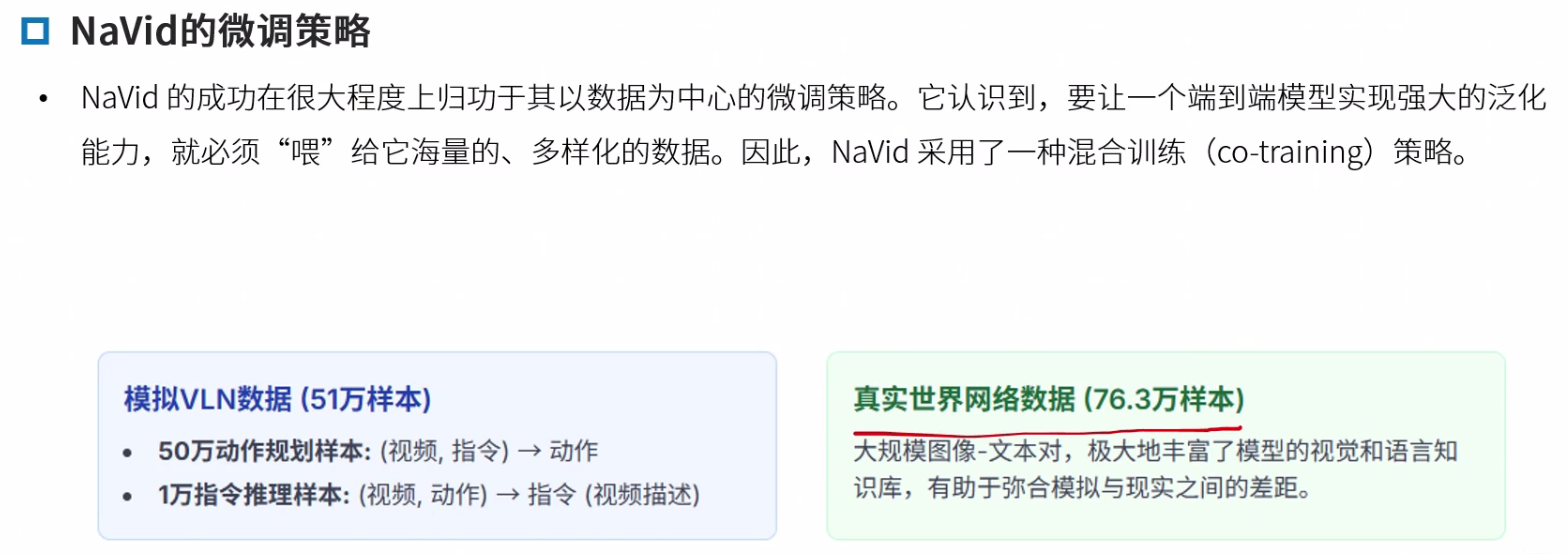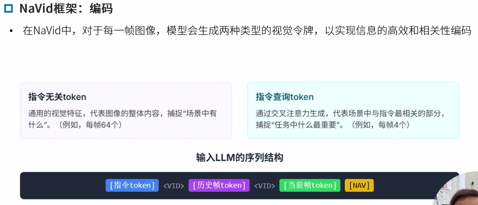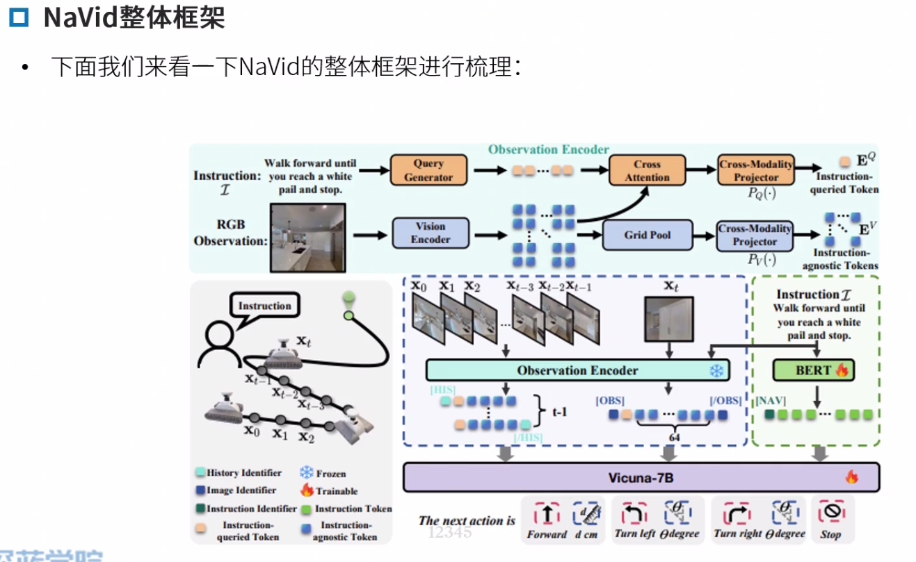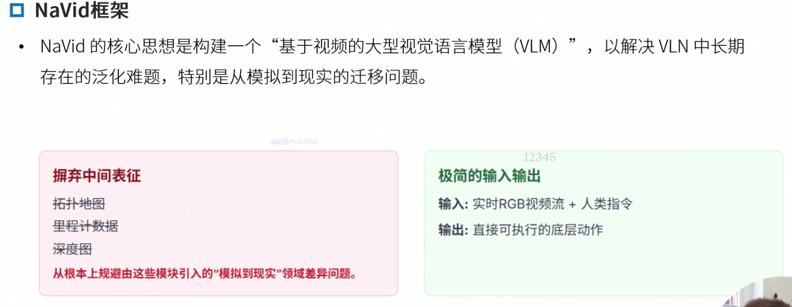 Navid的核心思想是构建一个“基于视频的大型视觉语言模型(VLM)”,以解决VLN中长期存在的泛化难题,特别是Sim2Real的迁移问题。