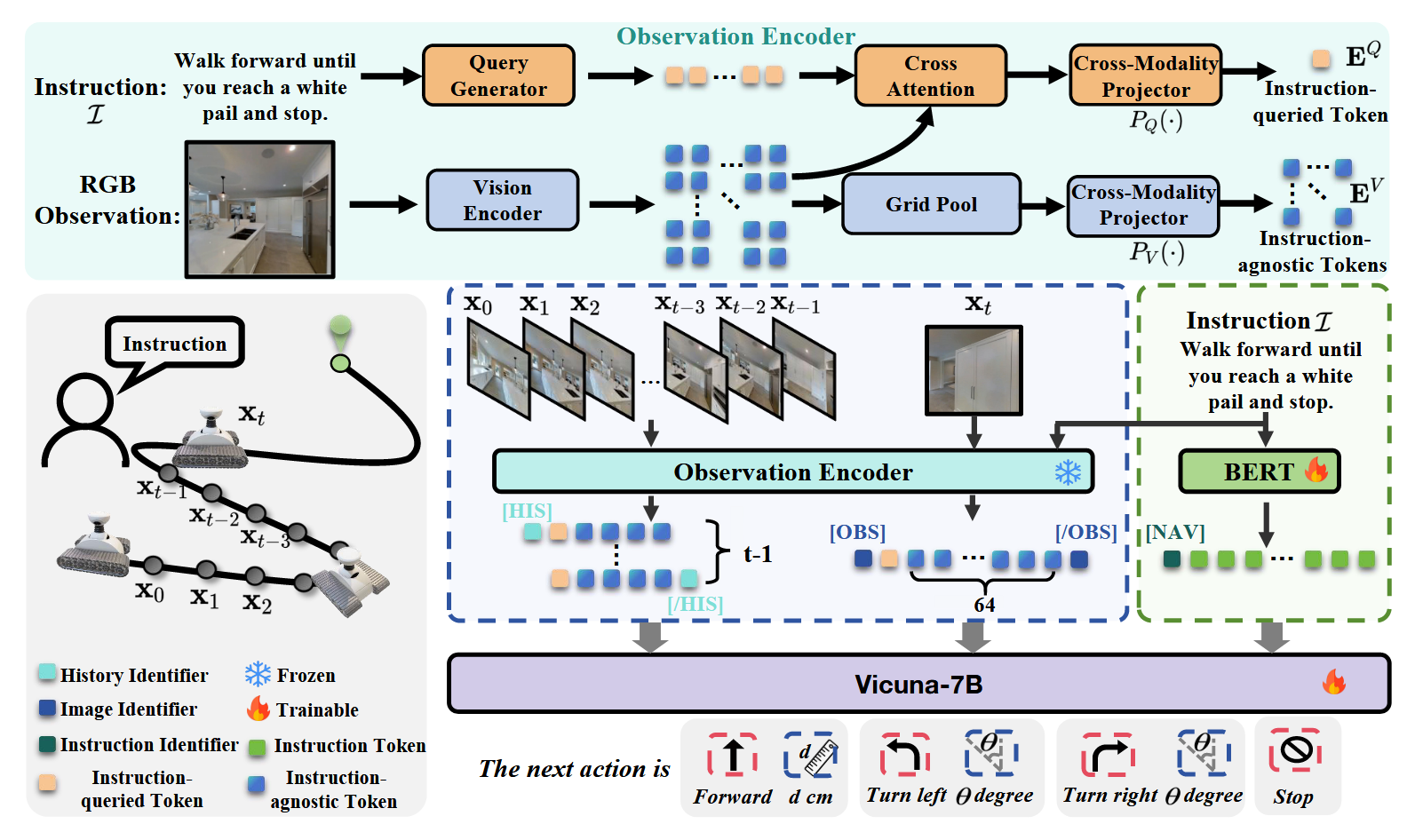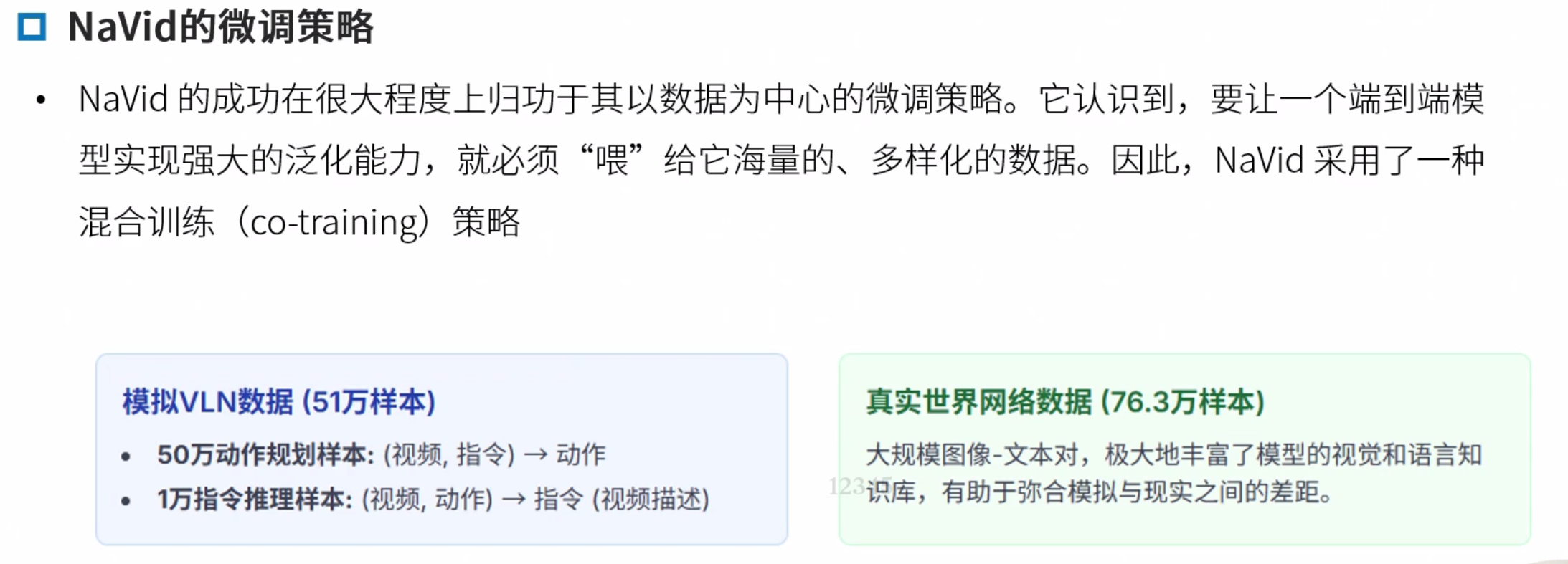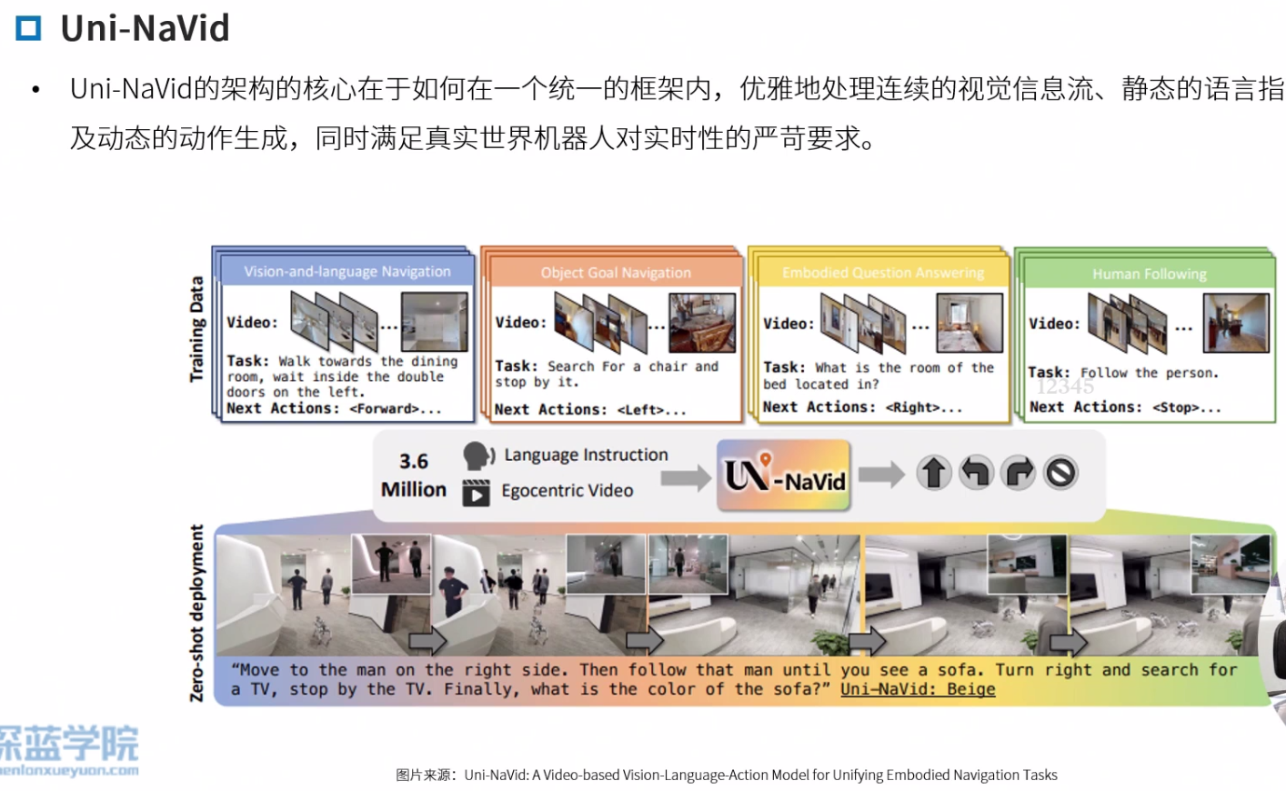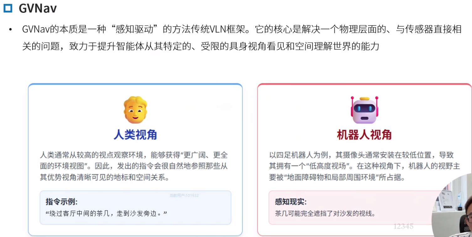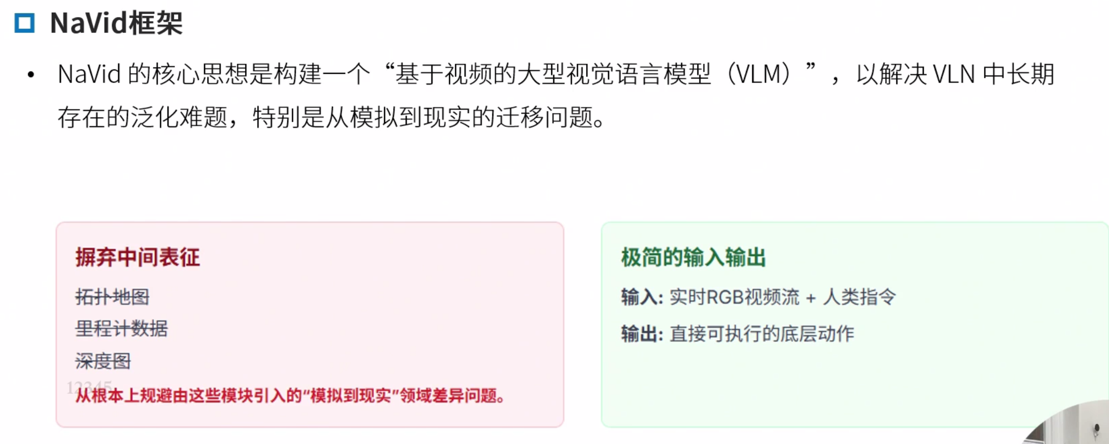 Navid的核心思想是构建一个“基于视频的大型视觉语言模型(VLM)”,以解决VLN中长期存在的泛化难题,特别是Sim2Real的迁移问题。